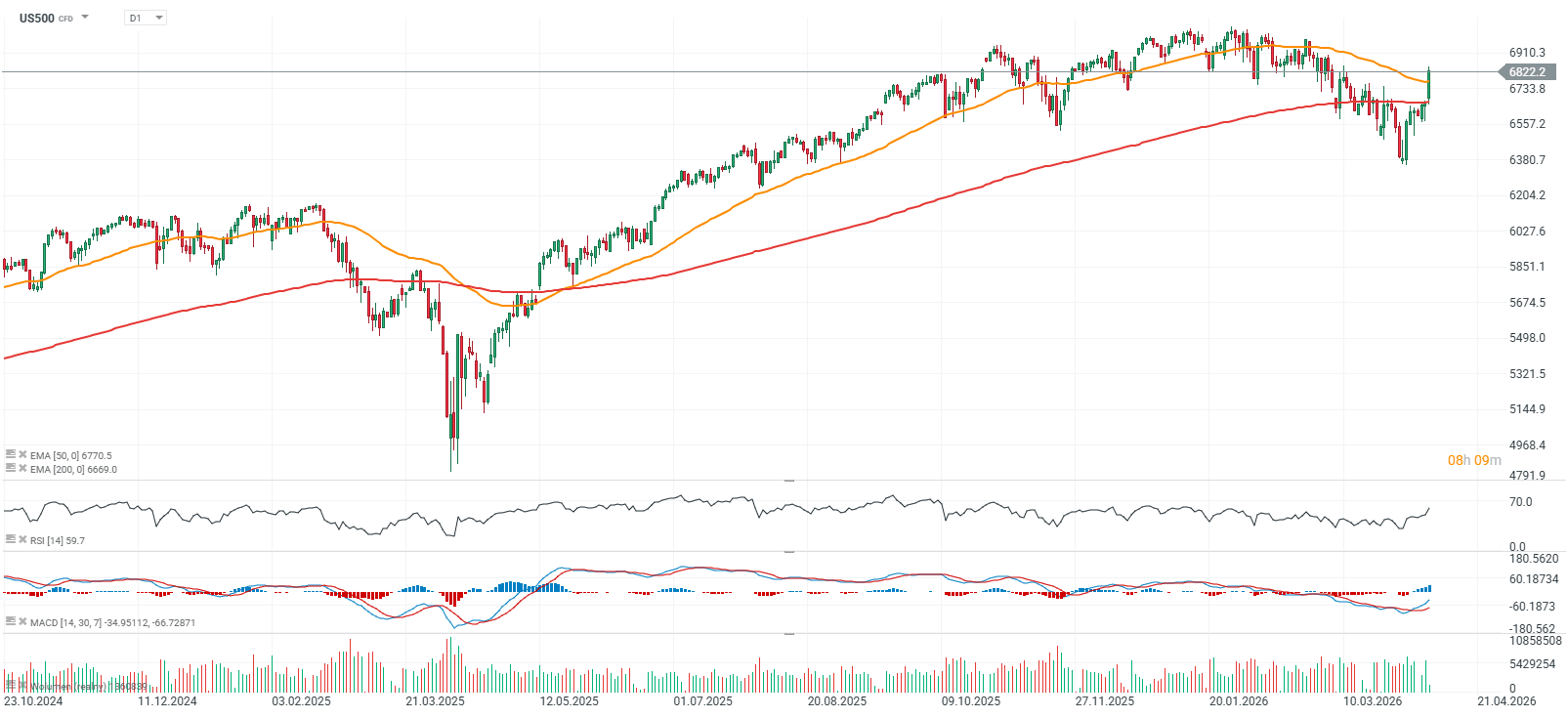 - The Dow Jones rose by 1,380 points (nearly 3%), the S&P 500 gained over 2.5%, and the Nasdaq 100 climbed almost 3%; the US500 contract is up 2.1%