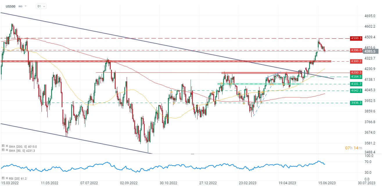 The US500 index is currently trading at 4380 points, representing a 0.14% decrease. The index initially opened with gains but later experienced a reversal, resulting in losses. It faced rejection from the resistance line at 4500 and has retreated to trade around the next resistance level between 4380-4400 points. If the index breaks below this zone, it could potentially trigger a further sell-off, potentially leading to a decline towards the 4300 range. Traders and investors should closely monitor the price action around these key levels for potential market movements and adjust their strategies accordingly.