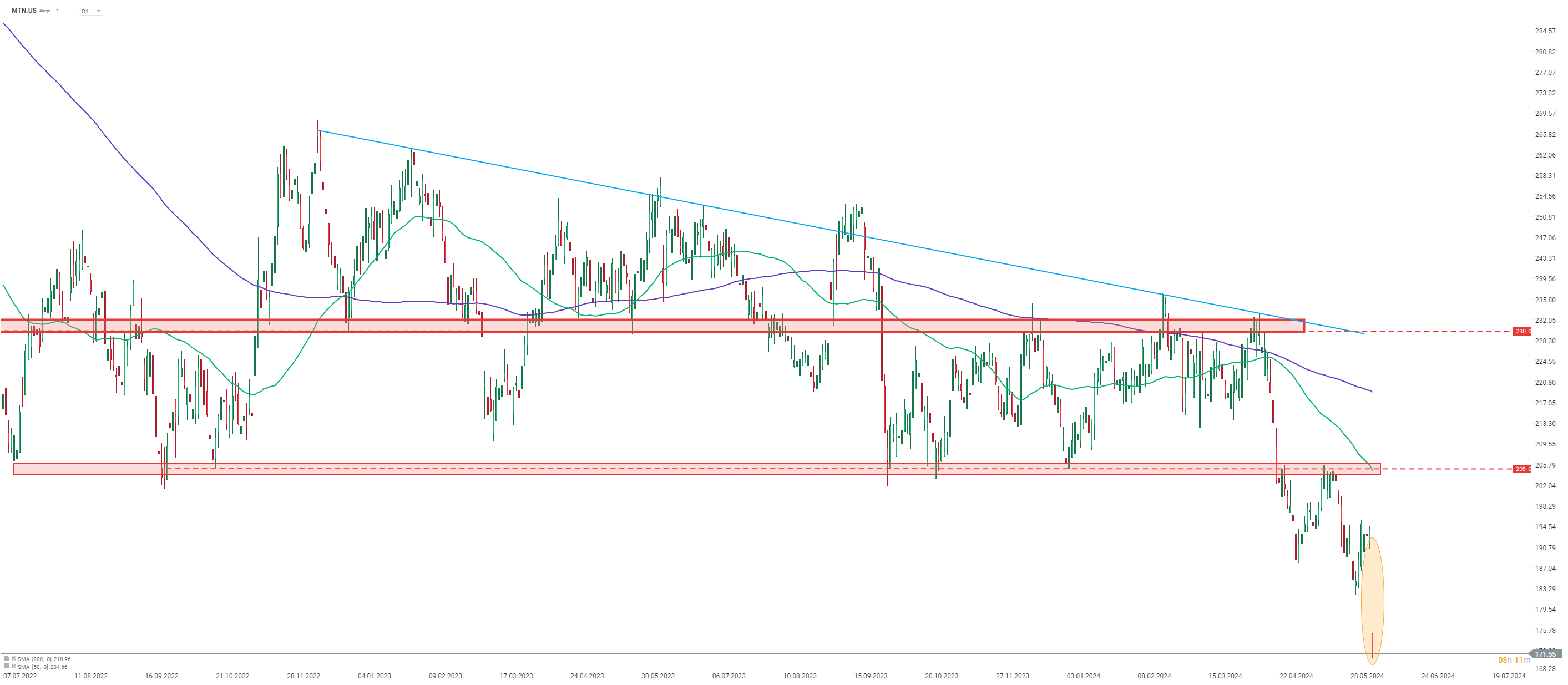 Vail Resorts (MTN.US) plunged over 10% after release of disappointing earnings report. Stock dropped to the lowest level since June 2024. Source: xStation5
