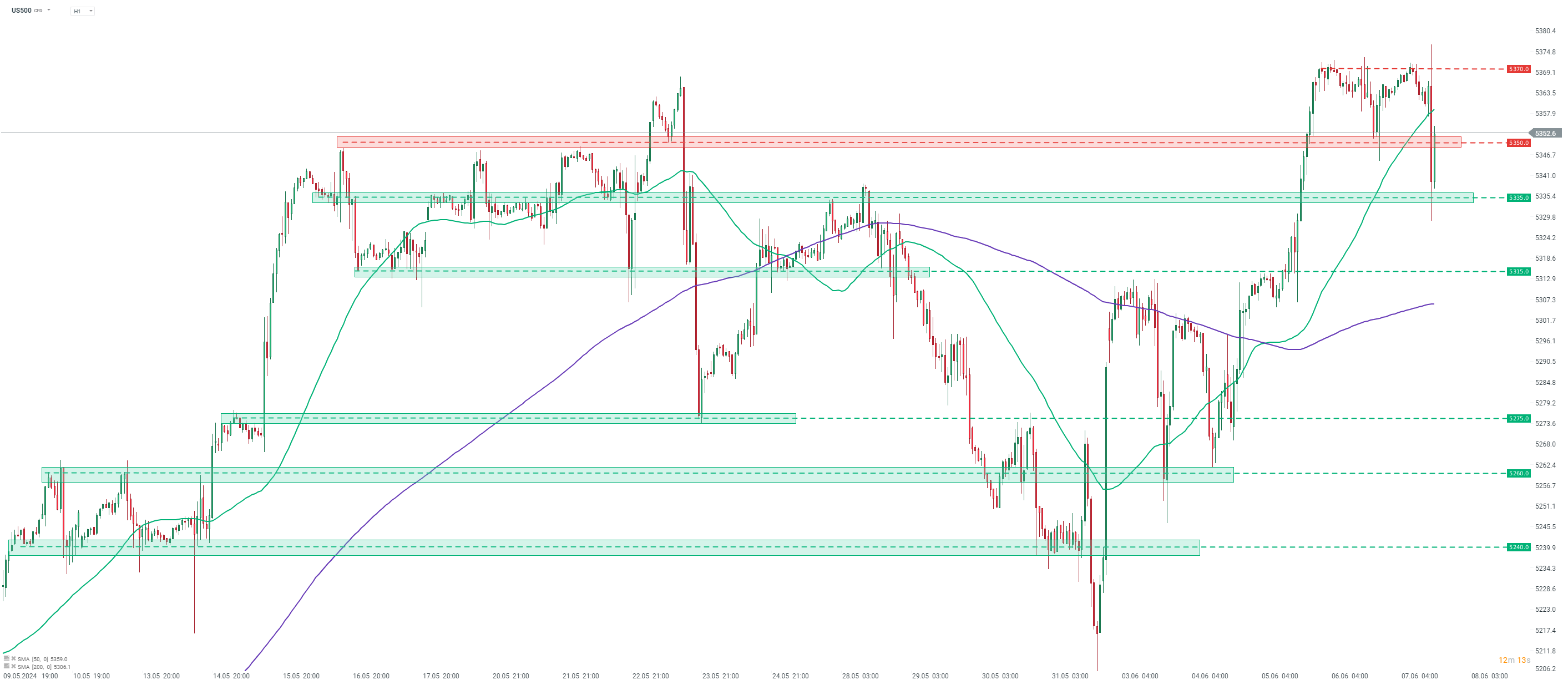 S&P 500 futures (US500) took a hit following release of US NFP report for May. However, sell-off was halted in the 5,335 pts area and the index began to recover losses. An attempt to climb back above the 5,350 pts area can be spotted at press time. Should bulls succeed, the next potential resistance to watch can be found in the 5,370 pts area. Source: xStation5