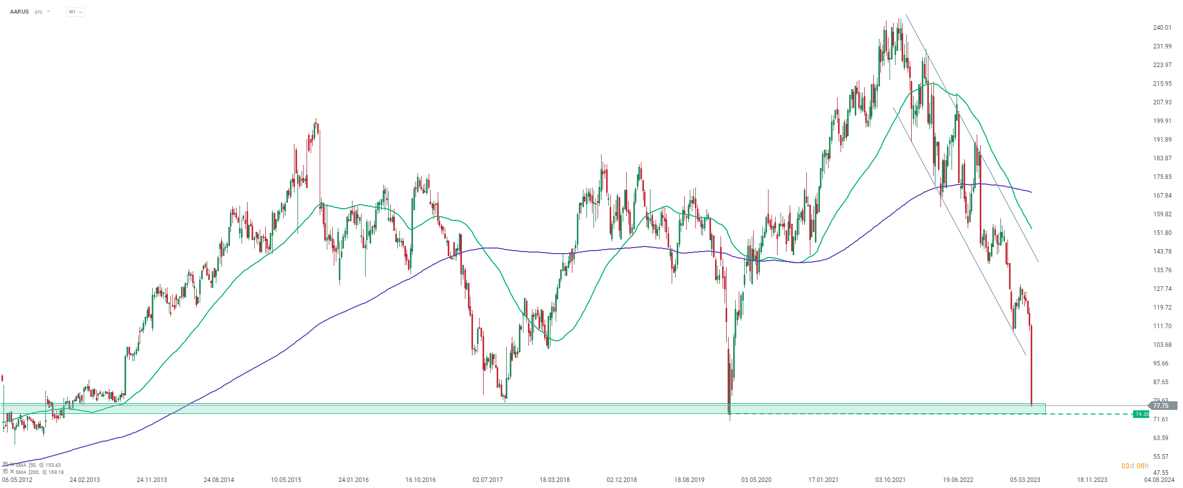 Advance Auto Parts (AAP.US) slumps 30% today after reporting disappointing fiscal-Q1 2023 earnings. Stock plunged below the lower limit of the bearish channel and is closing in on 2020 Covid lows. Source: xStation5