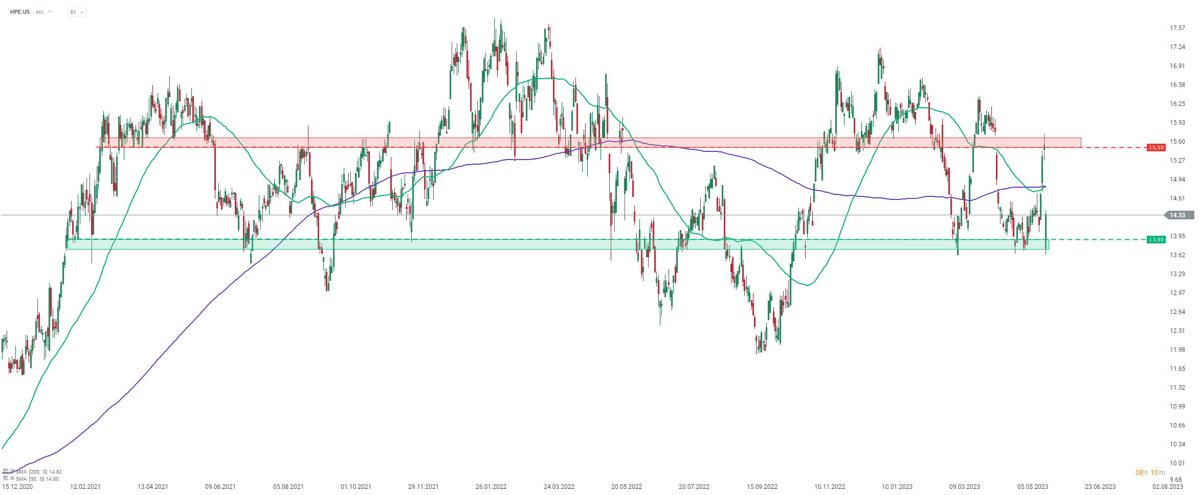 Hewlett Packard Enterprise (HPE.US) launched today's trading with an over-10% bearish price gap. Stock opened near the $13.90 support zone that has limited downward moves recently and it looks like bulls may manage to defend the area. Source: xStation5