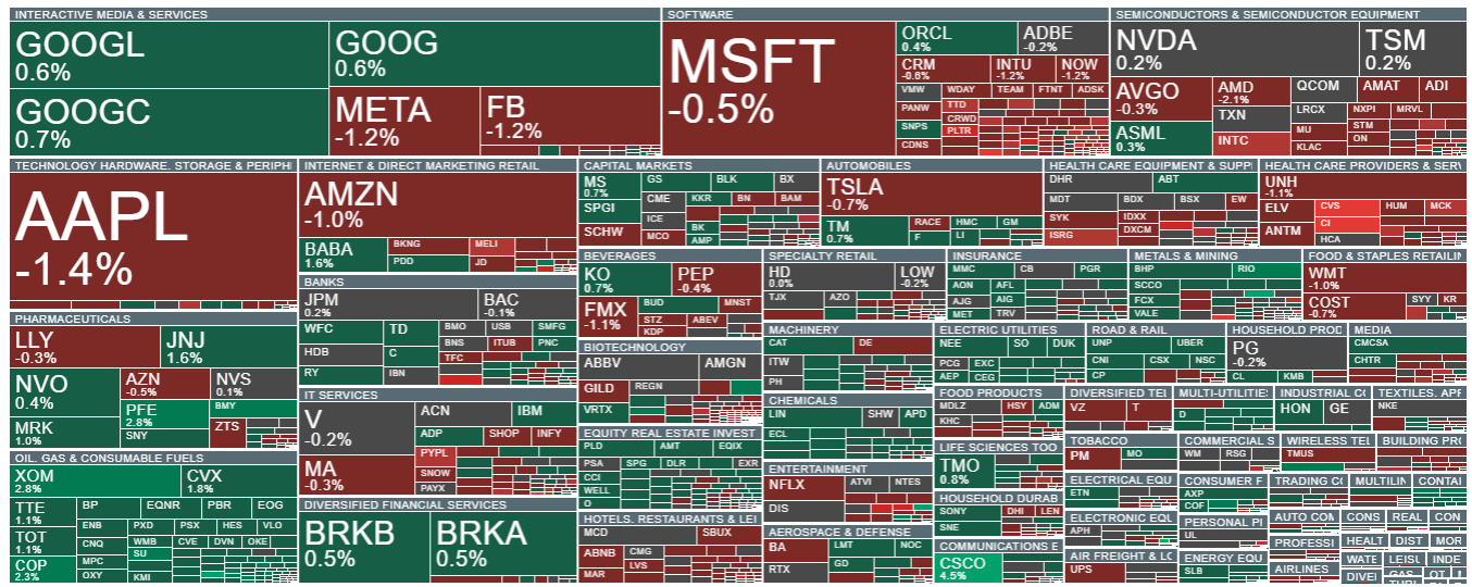 U.S. companies categorized by sector and industry. Size indicates market capitalization. Above-average oil market stocks did well today, supported by a rebound in indexes in China. Source: xStation5