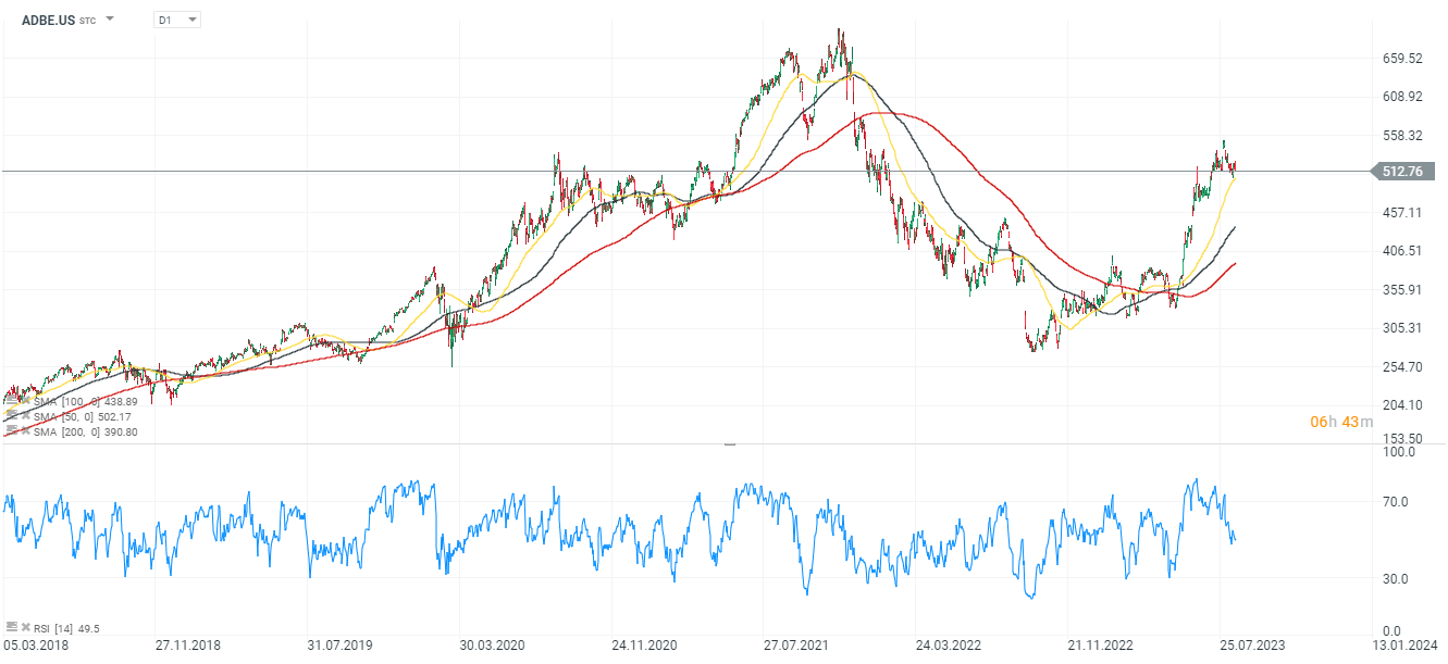 - Shares of Adobe Systems (ADBE.US) received no upswing today although Bank of America Global Research raised its recommendation for the company from neutral to buy, pointing to it as a growing global AI leader. Shares are slipping around the SMA50 (yellow line).