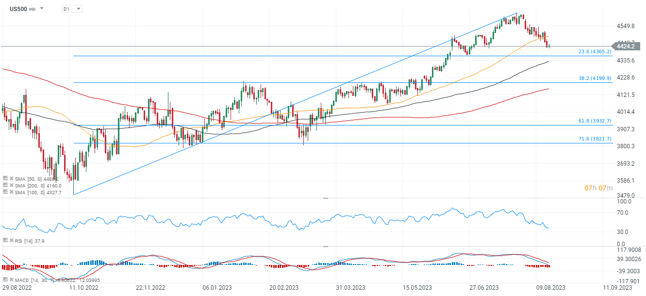 Today's US session brings another weaker day for the bulls, with gains mostly from oil and commodity companies, which were supported by a rebound in China's indices. Faced with the prospect of further tightening by the Fed, Wall Street is beginning to see 'risk' on the side of still strong macro readings, which may encourage the Fed to 'tighten the screw' on monetary policy. Yesterday's Fed minutes although they did not contain anything the market could not expect emphasized that the Federal Reserve may 'experiment' with further hikes in the face of a still strong US economy and labor market. Today's macro data surprised markets slightly. The reflection that comes from yesterday's 'minutes' - if the Fed decides to hike it will probably do so in September, 'as long as the data is strong.