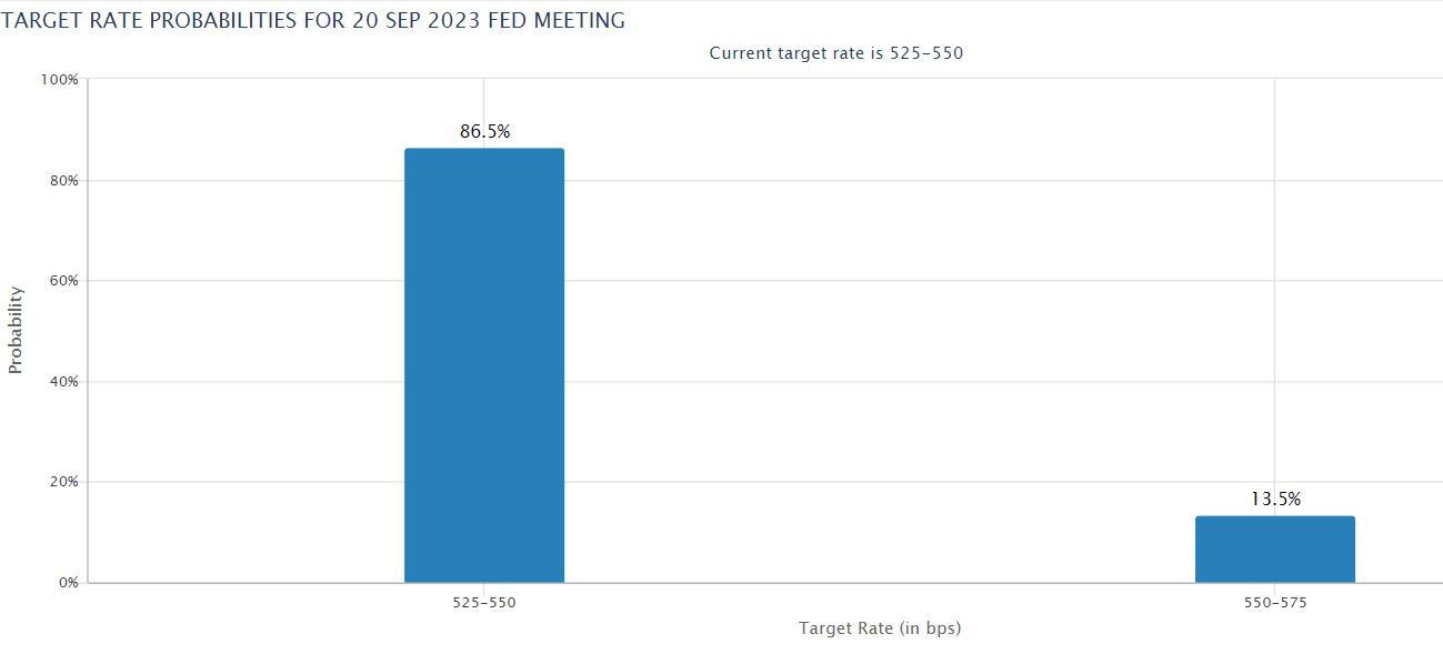The US500 index is losing slightly at the beginning of the session Source: xStation5 Fed minutes didn't change expectations for Fed decision at September meeting, Wall Street sees only 13% chance of 25bp hike Source: CME