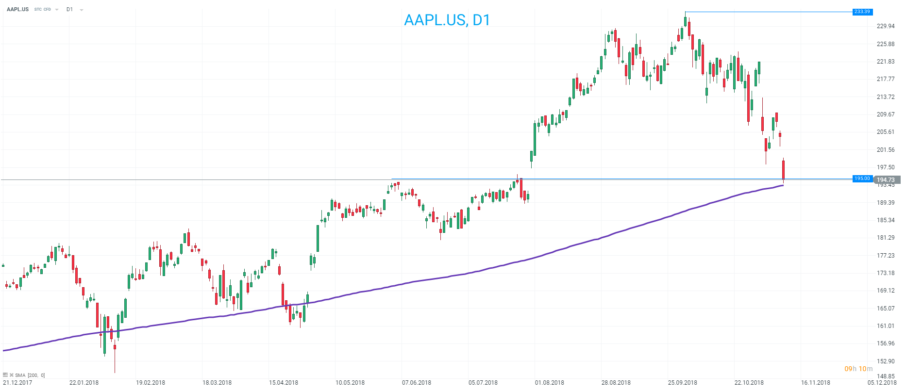 Apple has fallen back to test the 195 breakout level which also coincides with the 200 day SMA. Previous dips to this SMA have represented good buying opportunities but a failure to find support here could spell trouble not just for Apple investors but also the broader US stock market. Source: xStation