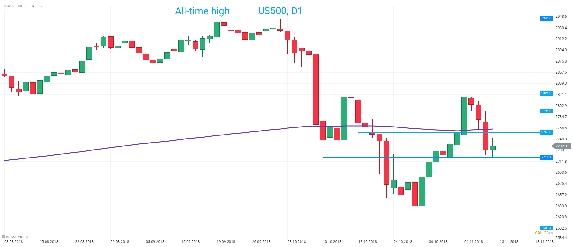 The recovery seen in US stocks since last month’s low is facing its first real test after the markets came under some pretty heavy selling pressure yesterday. The S&P500 (US500 on xStation) suffered its largest decline of the month so and fell over 70 points from high to low. In closing lower the market posted a 3rd consecutive red candle on D1 and furthermore the 3rd time in as many days that price has made lower highs and lower lows - also note that today the market has already made a new low and would need quite the bounce to not make a lower high beneath 2795.