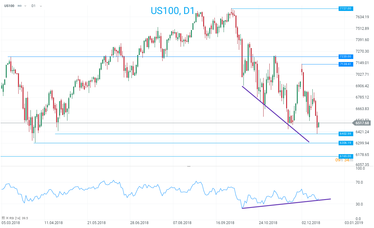 The US100 has found some support around 6400 after heavy recent declines. Positive divergence on the RSI could be seen as encouraging for longs and as long as this level holds then there is scope for a recovery ahead. Source: xStation