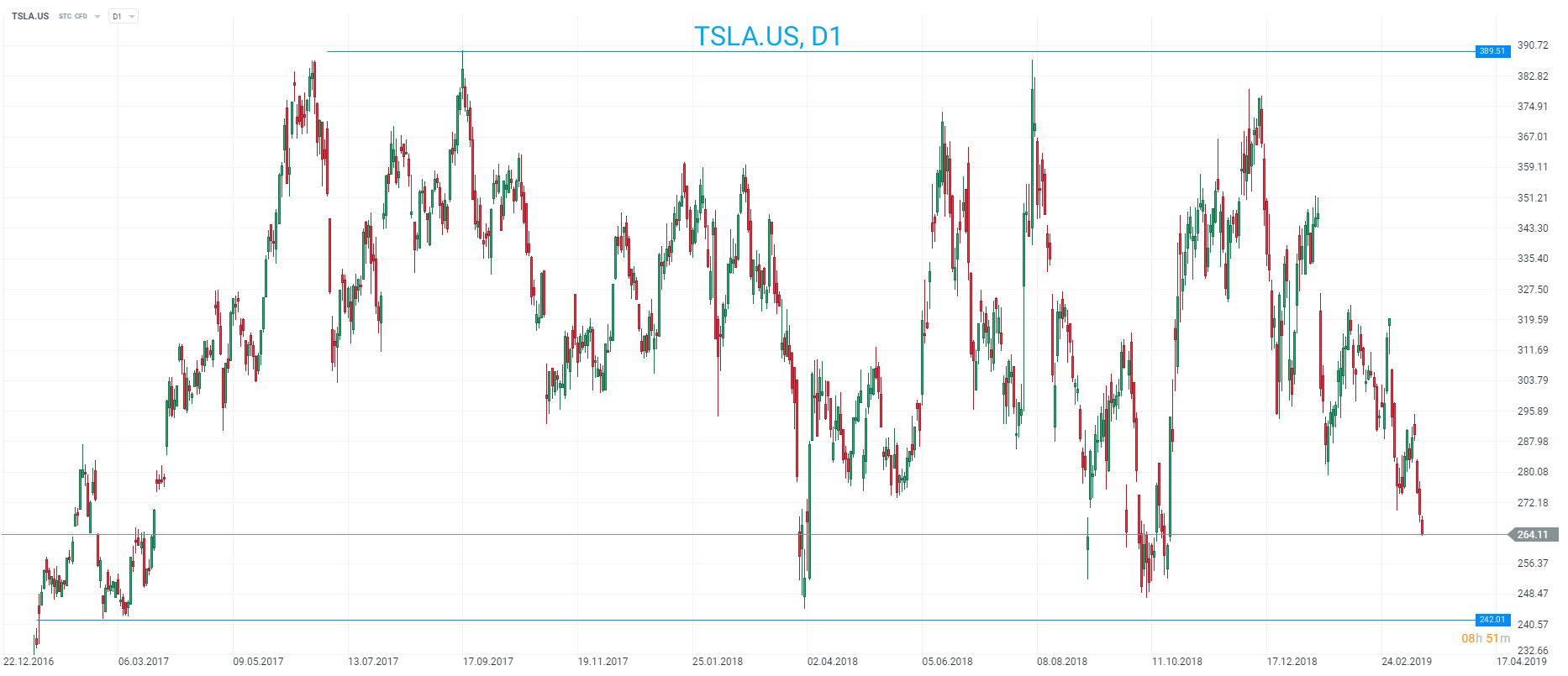 Tesla shares have fallen lower once more and are now far from the lower bound of the trading range seen in the past couple of year around 240. Source: xStation