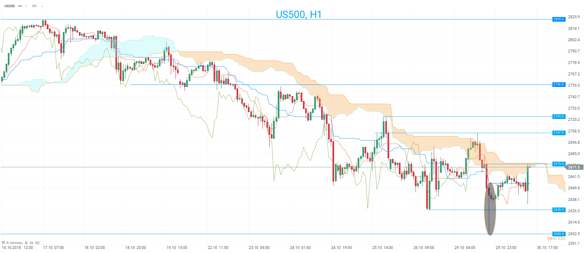 The US500 showed a large hammer on H1 into last night’s close which could be taken as a positive sign going forward. The top of the H1 cloud is currently around 2675 and if the market can get back above there today then the short term trend could be seen to have turned upwards. Source: xStation