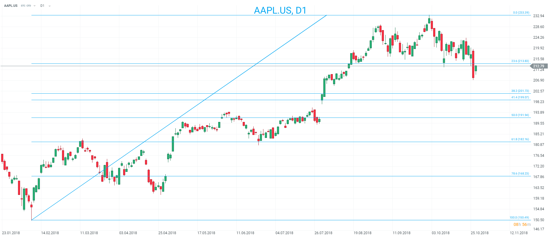 Apple shares have been holding up better than most tech stocks during the recent sell-off with the stock only breaking below the 23.6% fib of the rally since January yesterday. The firm is expected to announce new products at a show in Brooklyn this afternoon. Source: xStation