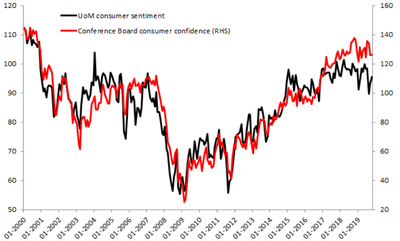 The consumer in the US remains fairly upbeat according to the latest conference board data, and both this metric and the Uni Mich equivalent are not far from their highest levels since 2000. Source: XTB Macrobond
