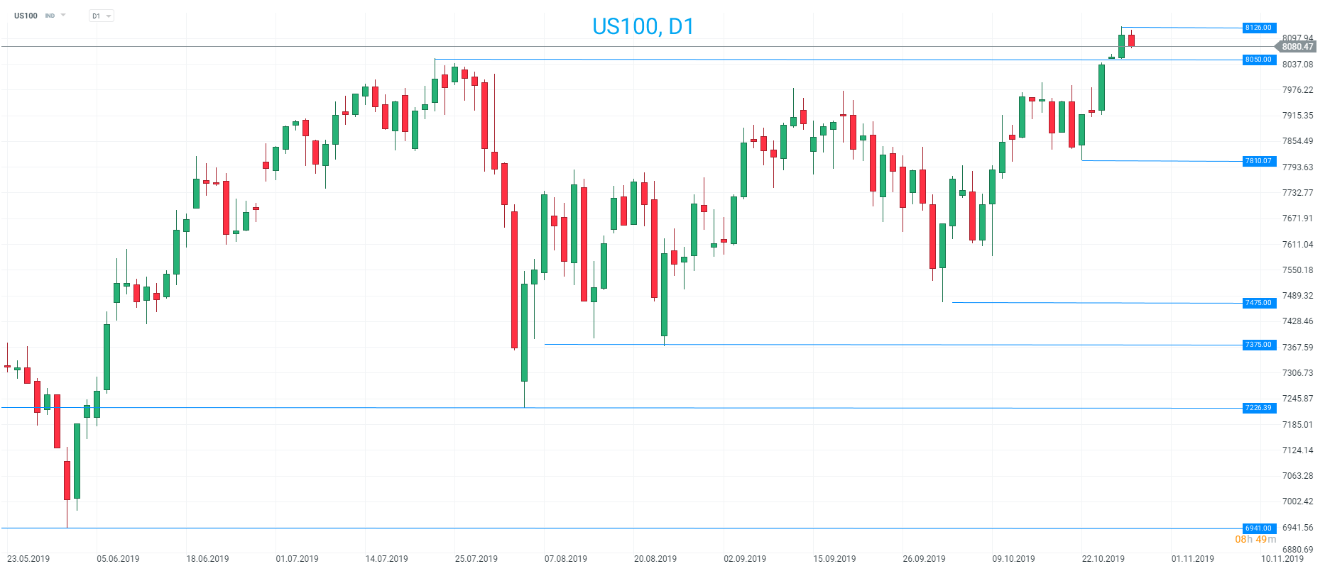 The US100 has dipped a little today, with shares in Google weighing on the market. However, price is still not far from Monday’s all-time high of 8126. Source: xStation