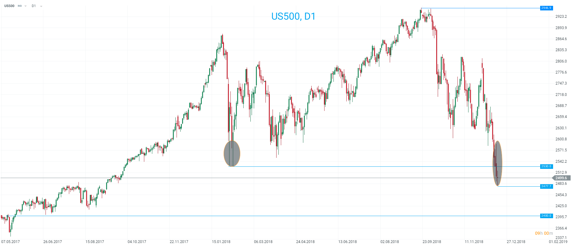 The US500 plunged after the Fed rate decision with the market taking out the prior 2018 lows of 2530. In breaking this support there’s now scope for further declines with 2400 the next real swing level to the downside. Before that daily lows of 2478 could be worth watching closely. Source: xStation
