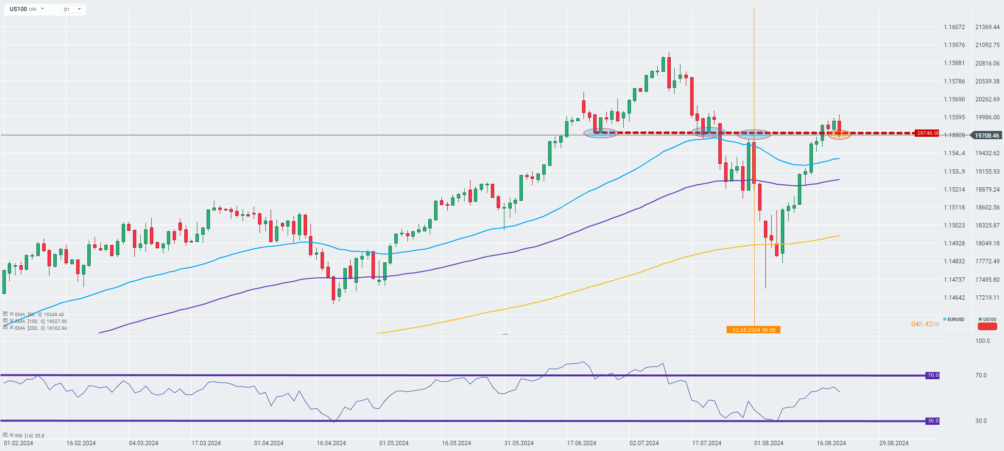 Much about monetary policy and the direction of the Fed's decision may be brought by Powell's speech, which investors are particularly looking forward to. If the fears of recession hanging over the market are confirmed, one can expect sharper movements on stock indexes. If, on the other hand, Powell reverts to hawkish rhetoric, the markets may also clearly feel it due to investors' strong pricing of the first reductions in September. In particular, the Russell 2000 index is exposed to stronger declines in such a scenario. Smaller companies are rebuilding their gains after the slump in early August precisely under the scenario of upcoming interest rate cuts on the assumption of a “soft landing” of the economy.