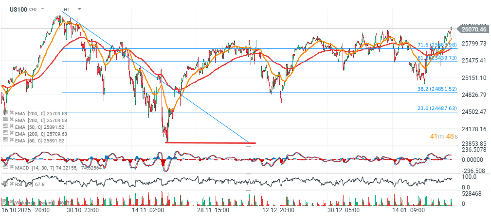 Shares of the largest U.S. technology companies are supporting gains in Nasdaq 100 (US100) futures ahead of tomorrow’s key risk events: the Fed decision (6 PM GMT, with Powell’s press conference at 6:30 PM GMT) and after-hours earnings from Meta Platforms (META.US) and Microsoft (MSFT.US). Both companies will report Q4 2025 results after the U.S. close and will likely shape expectations into what is effectively the “peak” of the current U.S. earnings season. Broader U.S. equity sentiment is also being helped by a sharply weaker dollar today.