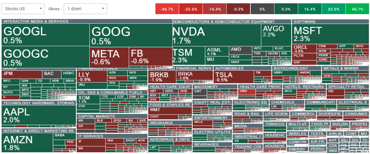 - Big Tech is clearly outperforming the wider market. Nvidia, Apple, Amazon, and Microsoft are up close to 2%, while additional momentum is coming from semiconductors. Shares of Taiwan Semiconductor and ASML are rising even more than the flagship U.S. tech names, giving the index a meaningful tailwind.