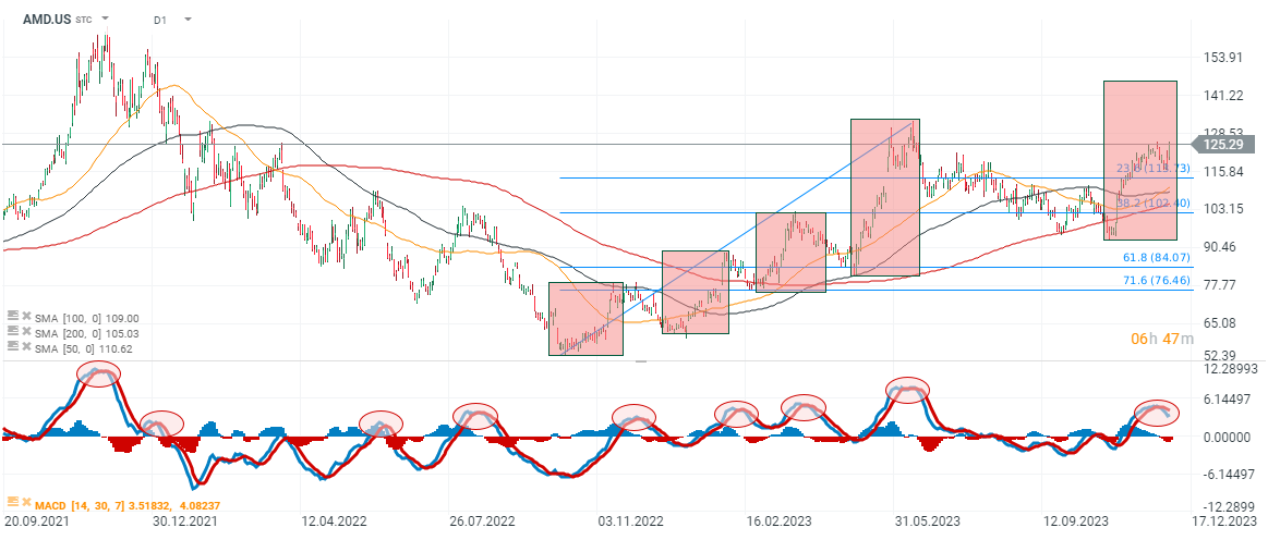 Advanced Micro Devices (AMD.US) shares gain nearly 8% after AI chip presentation and positive company comments signaling demand for new semiconductors. The MACD indicates potential profit-taking and a possible correction. On the other hand, if the 1:1 upward structure were to repeat, a rally even in the vicinity of $150 per share is not excluded. Source: xStation5