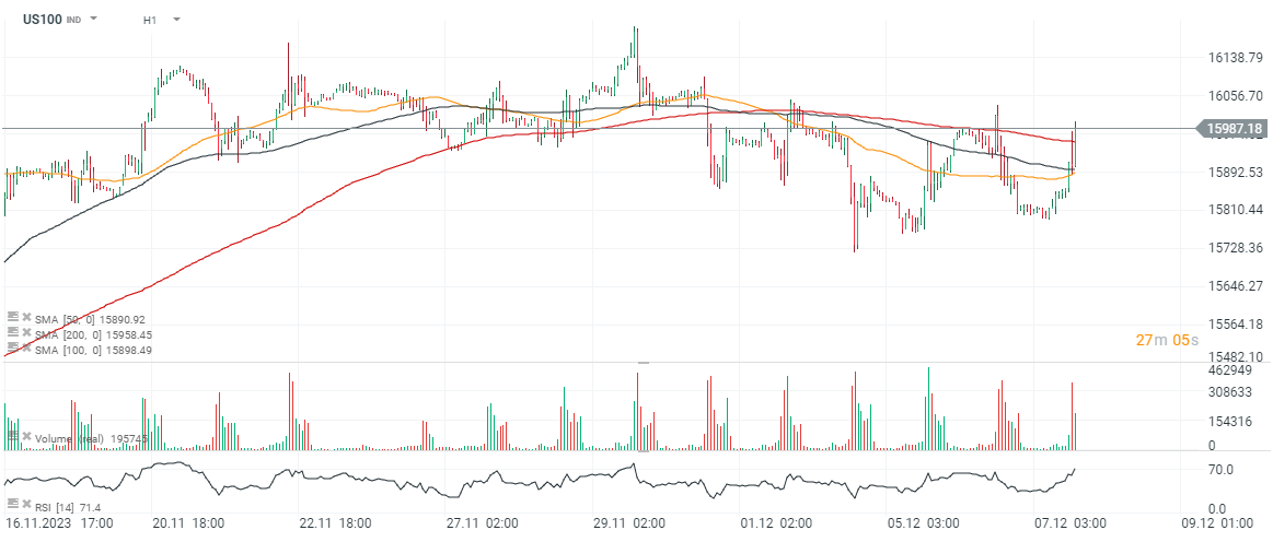 Looking at the US100, we see that despite the past 1% rally, the sell side prevails on the H1 volume bars. Nonetheless, the benchmark managed to rise above the SMA200, SMA100 and SMA50 averages and is trying to extend the rally in 16,000 points zone.![]()