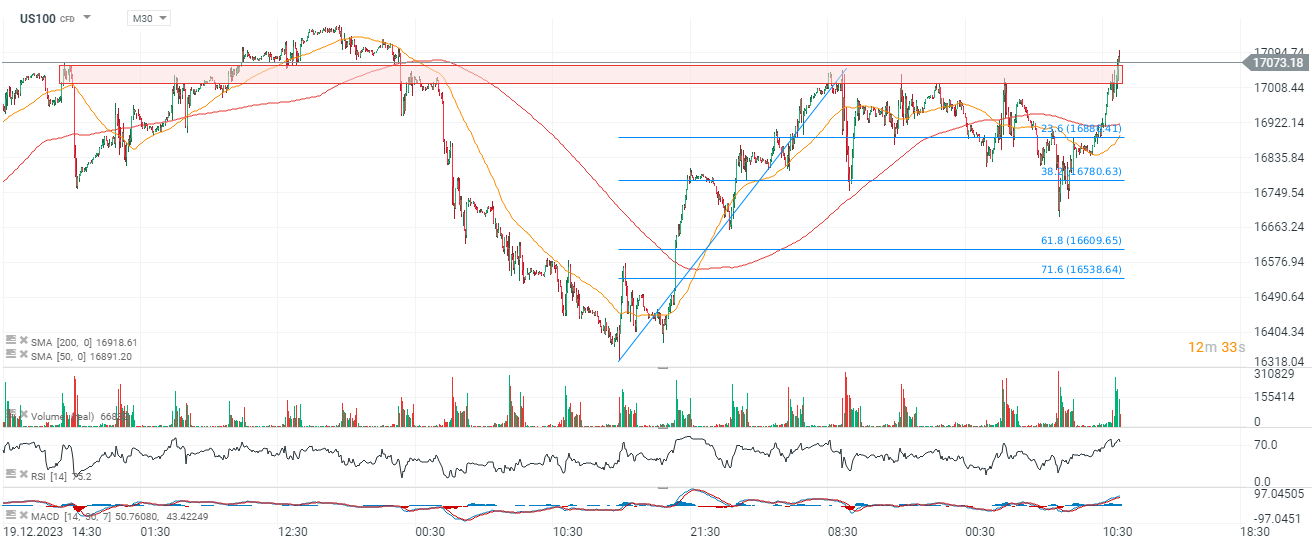 Futures on Nasdaq100 (US100) soars more than 1.4% today and stronger than expected macro readings from US didn't stop Wall Street bulls, as Taiwan Semiconductors improved sentiments among chip producers.