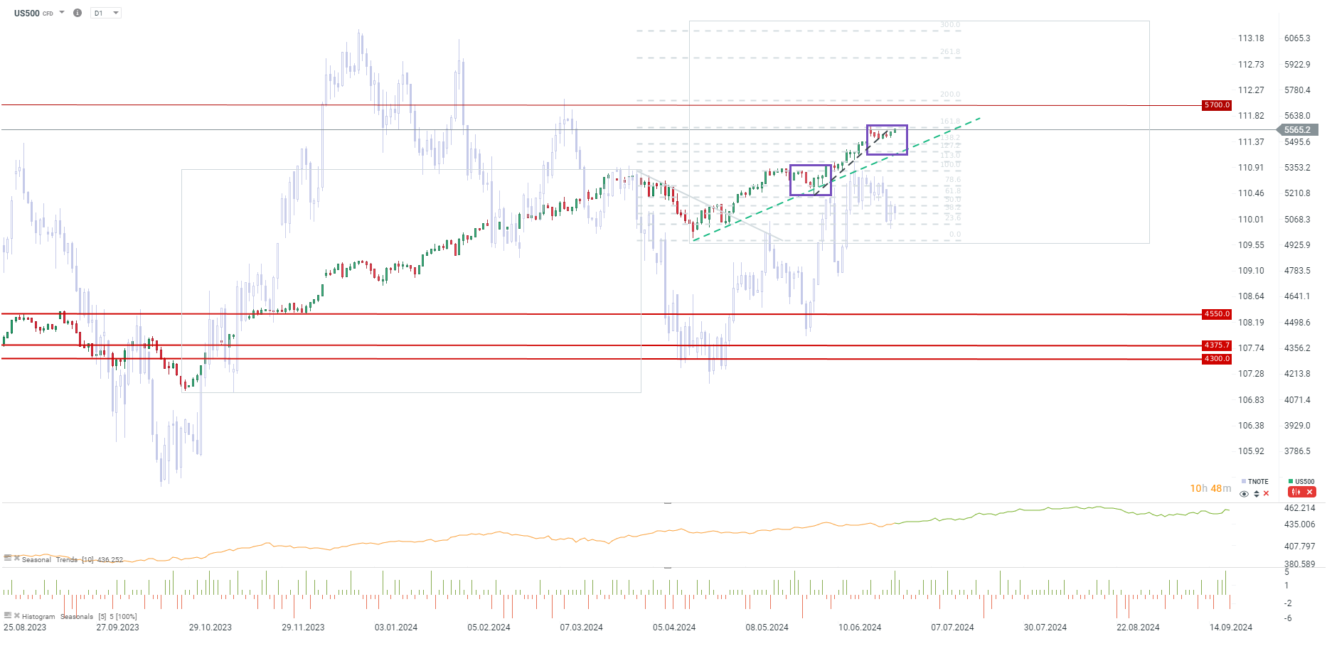 Investors are optimistic about today's reading, which creates some risk when the reading comes out significantly higher than expectations (in which case the correction could be deeper than the nearest support - the 5200 level was an important level to watch). Nevertheless, if inflation shows that it is under control, this will open the way for the US500 to test recent local highs. Although the upside on the US500 has been driven in 30% by the rise of Nvidia and largely AI-related companies, expectations of rate cuts could open the way for further upside on the US500. The 5590-5600 zone is a short-term resistance zone and a profit-taking attempt at this level cannot be ruled out (especially looking at the close of the quarter). Key support is located at 5500 and then at 5430. In the longer term, there is a chance that the US500 will continue to rise not only to 5700, but also to the 6000-6200 zone.