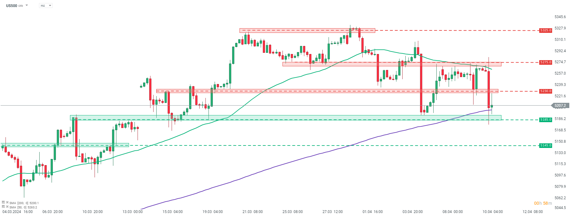 S&P 500 futures (US500) hold onto post-CPI losses ahead of FOMC minutes release. Pullback was halted at 200-period moving average (purple line, H4 interval) in the 5,200 pts area, but the index remains down over 1% on the day. Source: xStation5