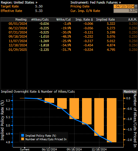 Money markets now see just an around-20% chance of Fed delivering the first rate cut at June meeting, following a hawkish CPI data for March released earlier today. Source: Bloomberg Finance LP