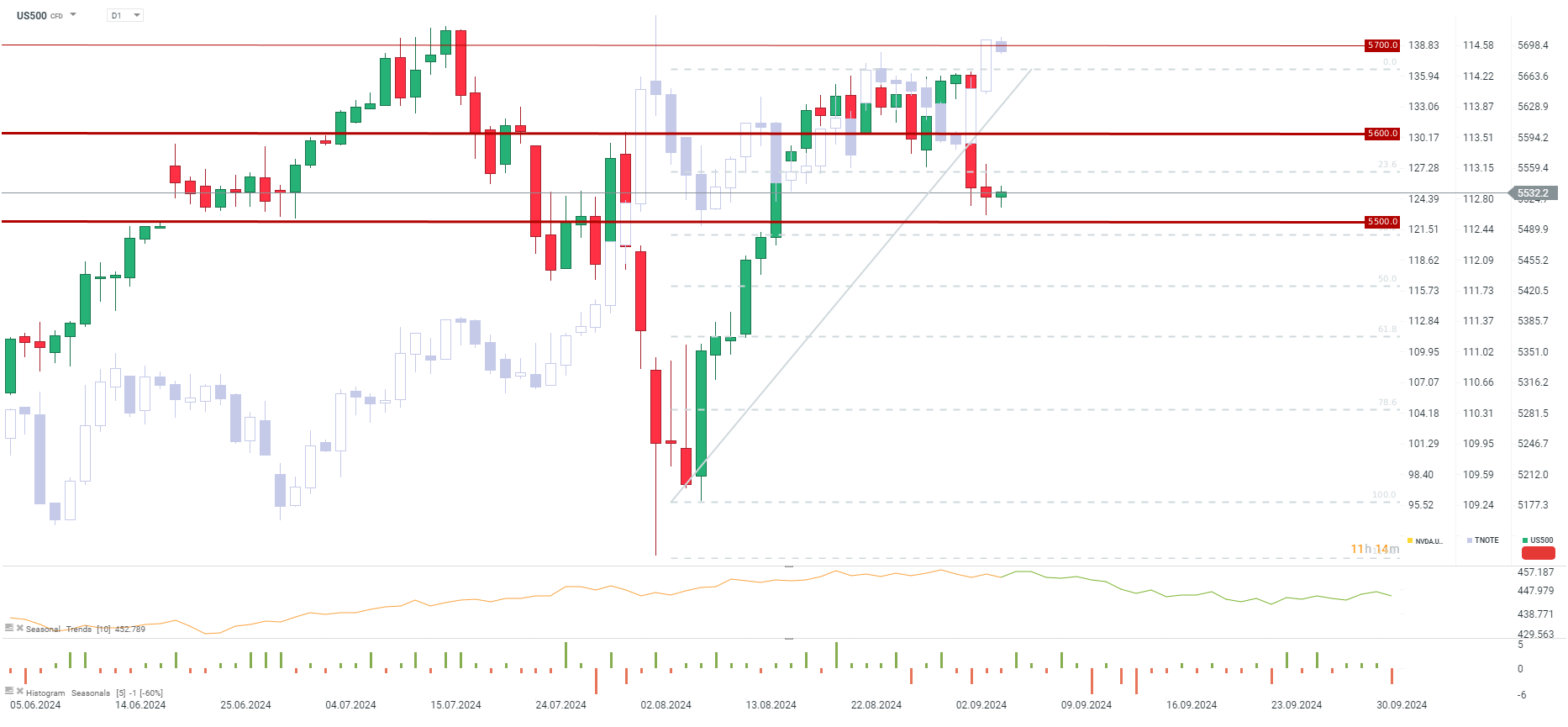 It's worth remembering that the July job data published in the beginning of August, which came in at 114k (with an expected rebound to 160k for August), led to significant concerns about the health of the US economy, resulting in a massive correction of almost 10% of US500 in early August. A rebound in US employment should restore market sentiment, but on the other hand, another weak reading closer to 100k could revive market fears and simultaneously significantly increase the likelihood of a 50 basis point rate cut during the September Fed meeting, scheduled for September 18th.