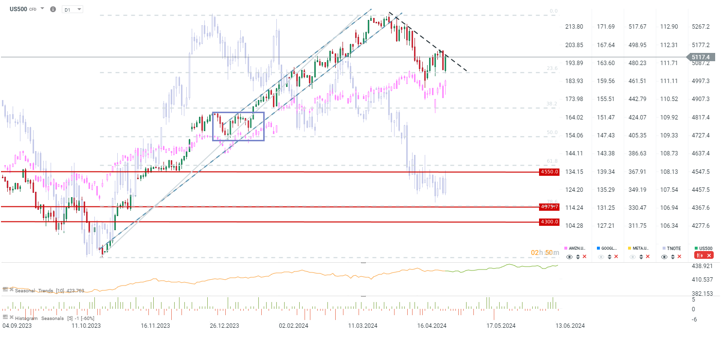 US500 is testing downward trend line and it is close to resistance close to local high at 5150. The next possible target for bulls is located at 5200 points. On the other hand the key local support is at 5040. Source: xStation5