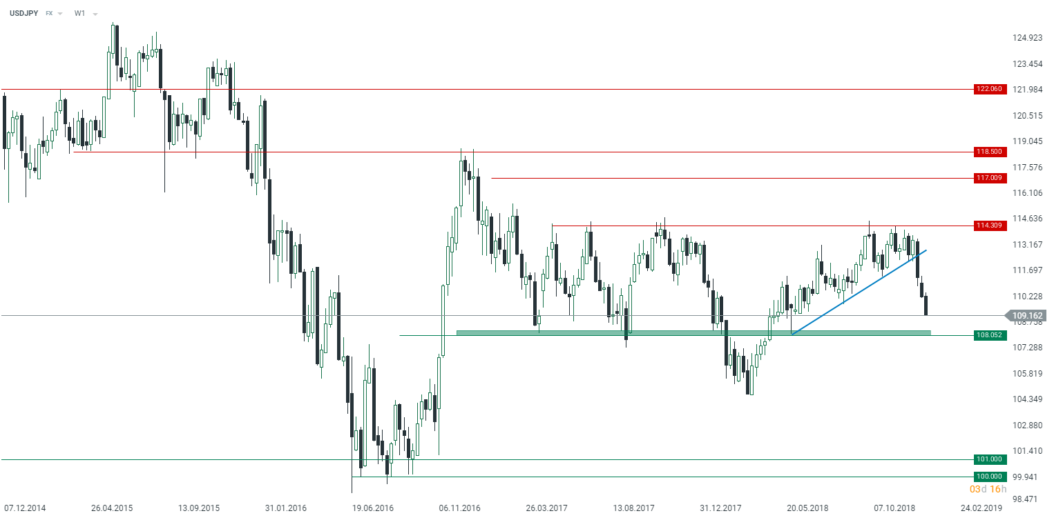 The first trading day of the new year has brought widespread weakness of the US dollar which is trading higher only against Antipodean currencies at the time of writing. Its relative outperformance against AUD and NZD stems from a disappointing PMI reading from China. The Chinese data has also increased demand for safe haven currencies such as JPY. At the same time gold prices are experiencing an increased demand as well being traded 0.4% higher. What is standing behind USD weakness? Well, it seems that arguments are the same - possibly less hawkish Federal Reserve and the most recently the US government shutdown. Neither of these events is expected to be set aside in the near-term therefore one may expect that the dollar may struggle in the upcoming days. Looking through some technical charts it is worth paying attention to the USDJPY as the pair has been performing in line with our earlier calls. Namely, the USDJPY has been falling after it broke through the trend line two weeks ago. The target for bears might be set at 108 where some traders might decide to cash in on their recent shorts.