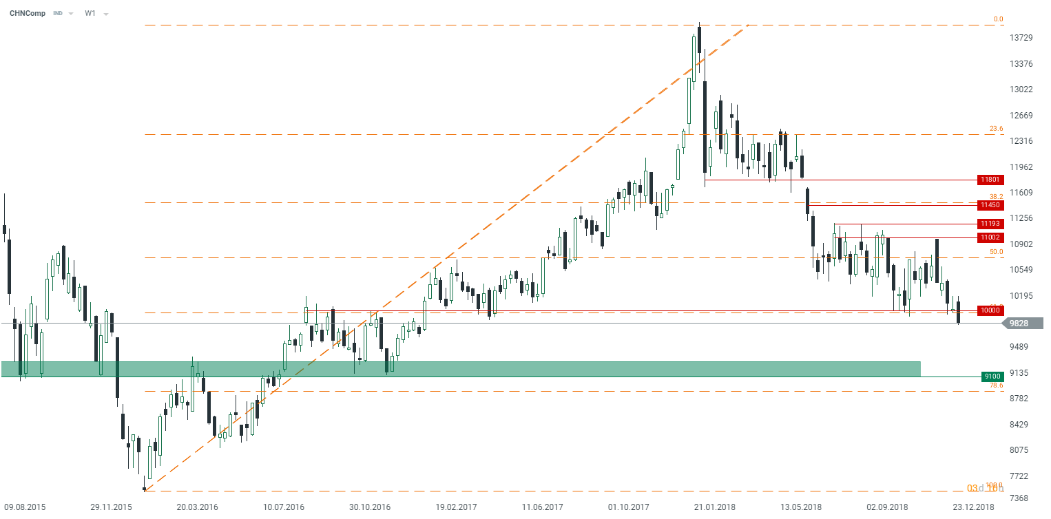 The Hang Seng has finally moved below 10000 points, the sign of a deeper pullback in the foreseeable future. Another target bears might be aiming for is set at 9100 points. Source: xStation5