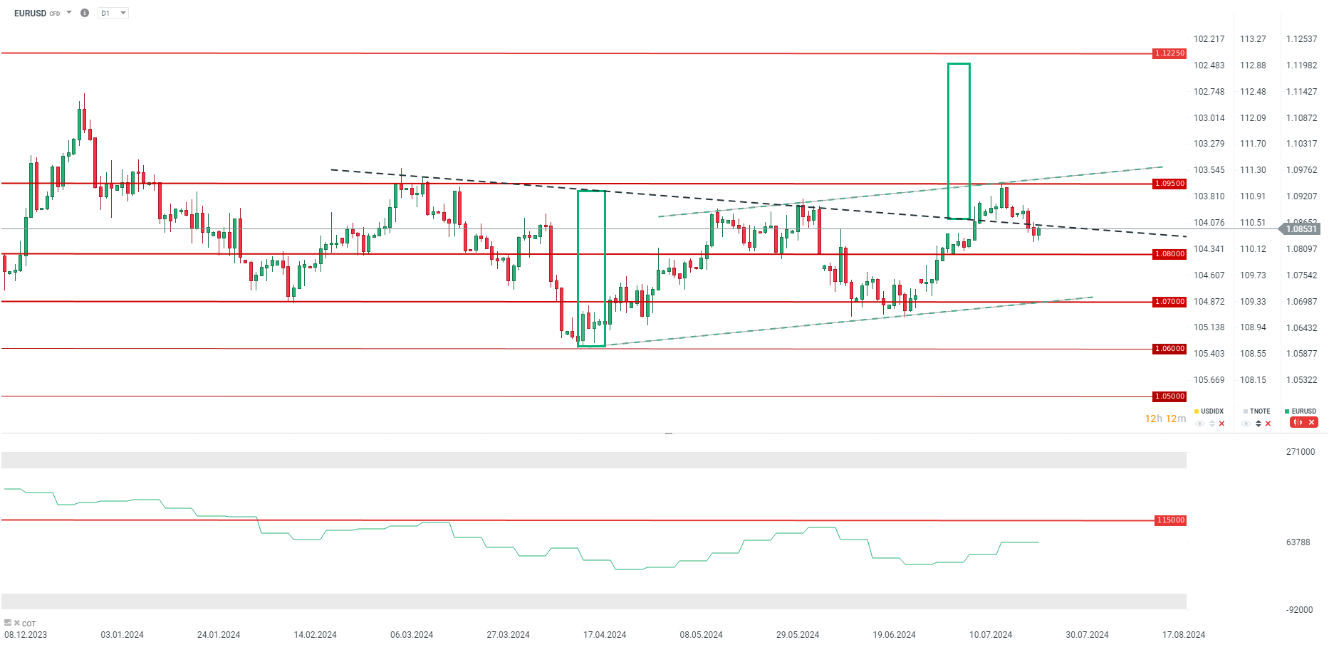 EURUSD is rebounding slightly this morning, despite negative data from Germany. Good data from the USA could push the pair back towards the 1.0800 level. However, if the GDP change falls below 2.0% and inflation data drops more than expected, a return to around the 1.0900 level is possible. Source: xStation5