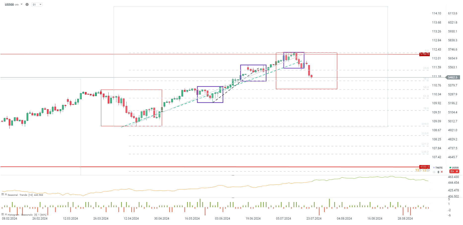 Index futures continue the declines that started last week, although the biggest drops occurred during yesterday's session. US500 is breaking through important support levels. Theoretically, strong GDP and a drop in price indexes should lead to a revival in the index, but strong GDP and a smaller decline in the deflator and Core PCE could reduce expectations for further Fed cuts and deepen the declines. In that case, the key support level will be 5430 during today's session and 5340 in the coming weeks. Source: xStation5