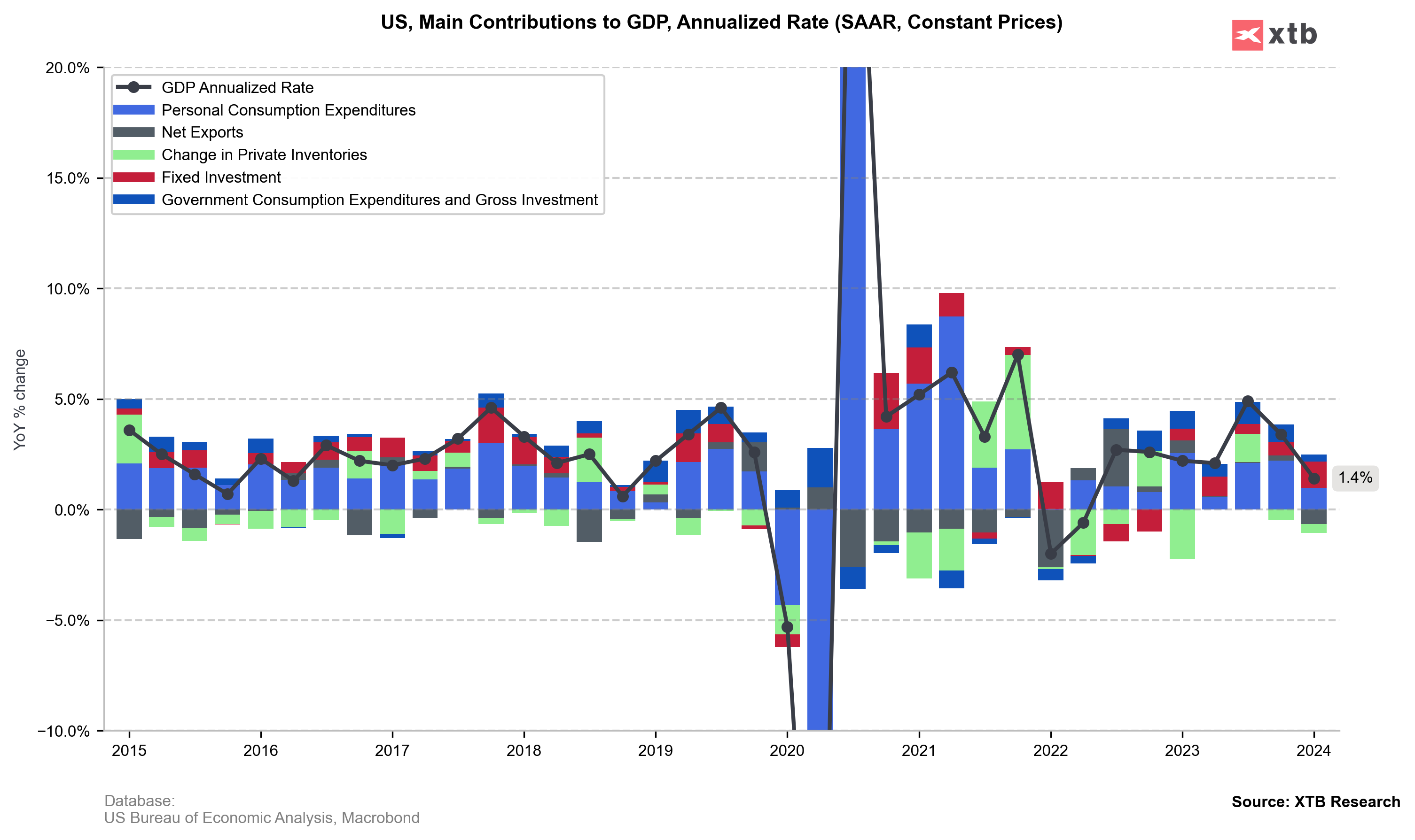 Growth in the first quarter was limited by net exports and inventories. It is expected that in Q2, the negative impact will come from net exports, but it will be larger than in Q1. However, in the second half of the year, economic growth may be influenced by a weakening labor market, which could lead to reduced spending. It does not seem that today's report will significantly change expectations for the Fed meeting next week or the anticipated rate cut in September. However, it may affect expectations for further moves this year. Source: Macrobond, XTB