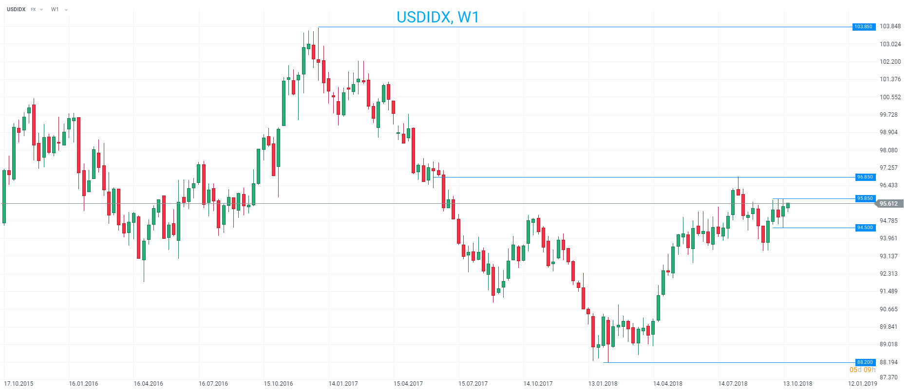 Even though the USD index has got off to a bright start this week the market remains in the narrow seen of late range from 94.50-96.85. Longer term the market is around the middle of its range seen over the past two years from 88.20-103.85. Source: xStation