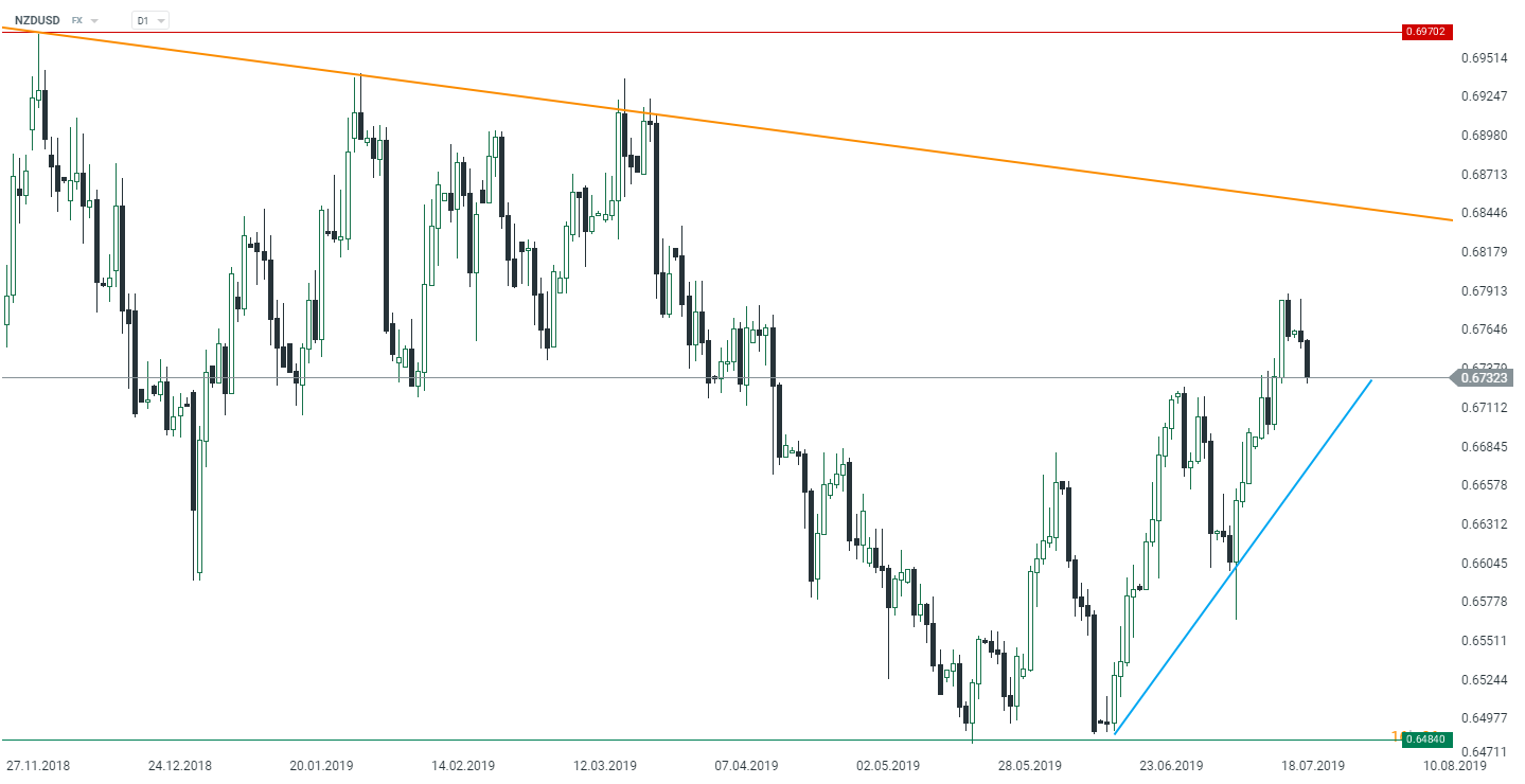 The US dollar is by far the strongest major currency in early European trading, and as a result the EURUSD is already trading below the key level of 1.12. The largest gains are seen against the Norwegian krone as well as the New Zealand dollar. In case of the former we may talk about an impact coming from oil prices which have stopped rising of late. In turn, the NZ dollar seems to be under pressure after Bloomberg reported some RBNZ-related headlines (we write about this topic further in this analysis). As far as the latest revelations are concerned, one needs to mention a deal struck between the White House and the US Congress to increase the so-called debt ceiling until the middle of 2021. It needs to be confirmed by both the House (it has to do so before July 26 when a six-week recess starts) and the Senate which could put it to a vote as late as next week. However, expectations suggest that the higher debt ceiling will become law and it if happens, it would mean that the next budgetary stand-off would arise after presidential elections scheduled for next year. Undoubtedly, this is a big advantage for Donald Trump who will be running for his second term in office.