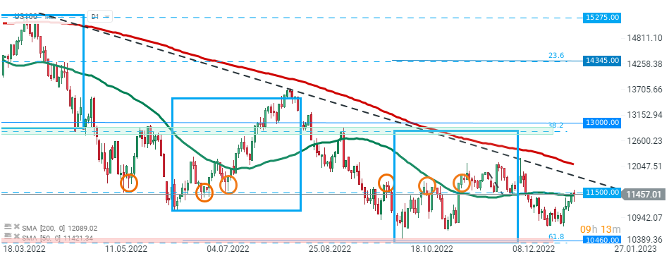 US100 also struggles to break above resistance at 11500pts. Source: xStation5