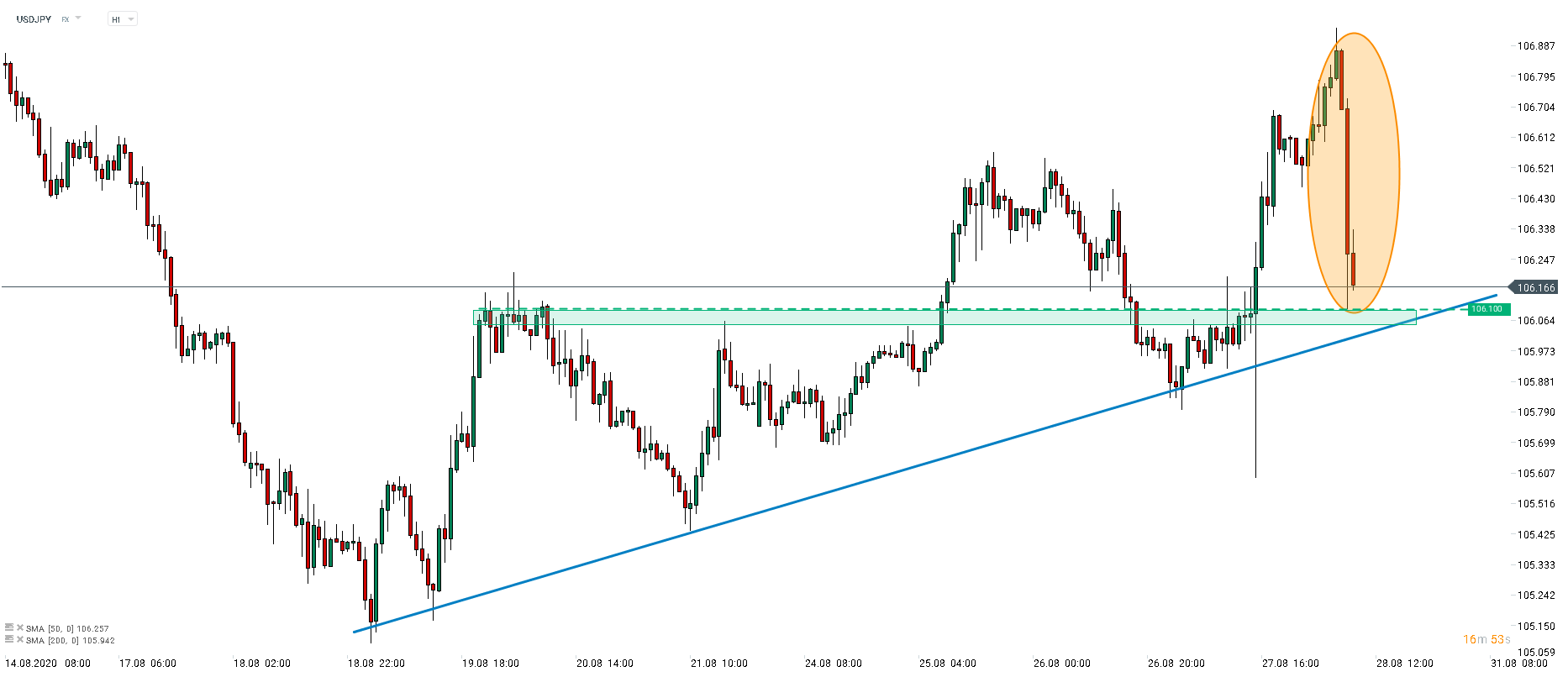 USDJPY dived on news that Abe plans to resign (orange circle). Key support to watch can be found at 106.10. Source: xStation5