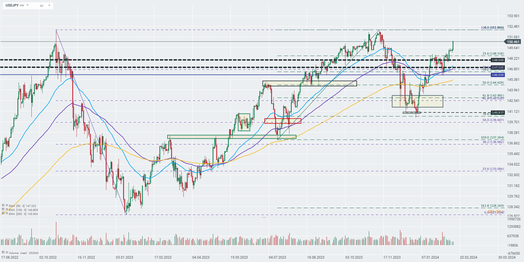 The USDJPY pair broke above the psychological 150.00 barrier for the first time since November 2023. Such a surge in the US dollar was due to a surprising CPI report from the US, which indicated that inflationary pressures in the economy were more resilient than previously expected, reducing expectations for faster interest rate cuts.