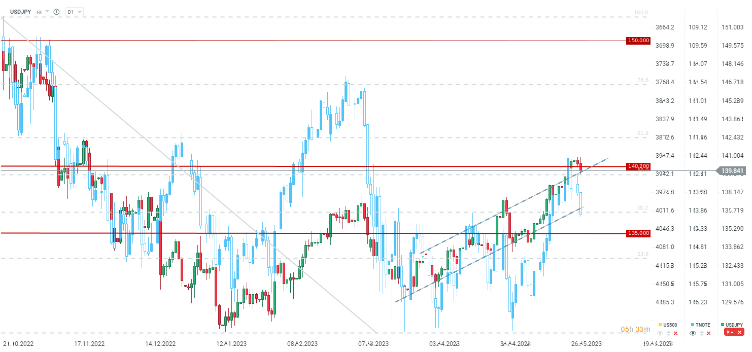USDJPY reacts to a sharp drop in US yields, driven by good sentiment towards the potential passage of the debt limit bill by Congress. Today at 8pm BST, the bill is due to be debated in committee in the House of Representatives.