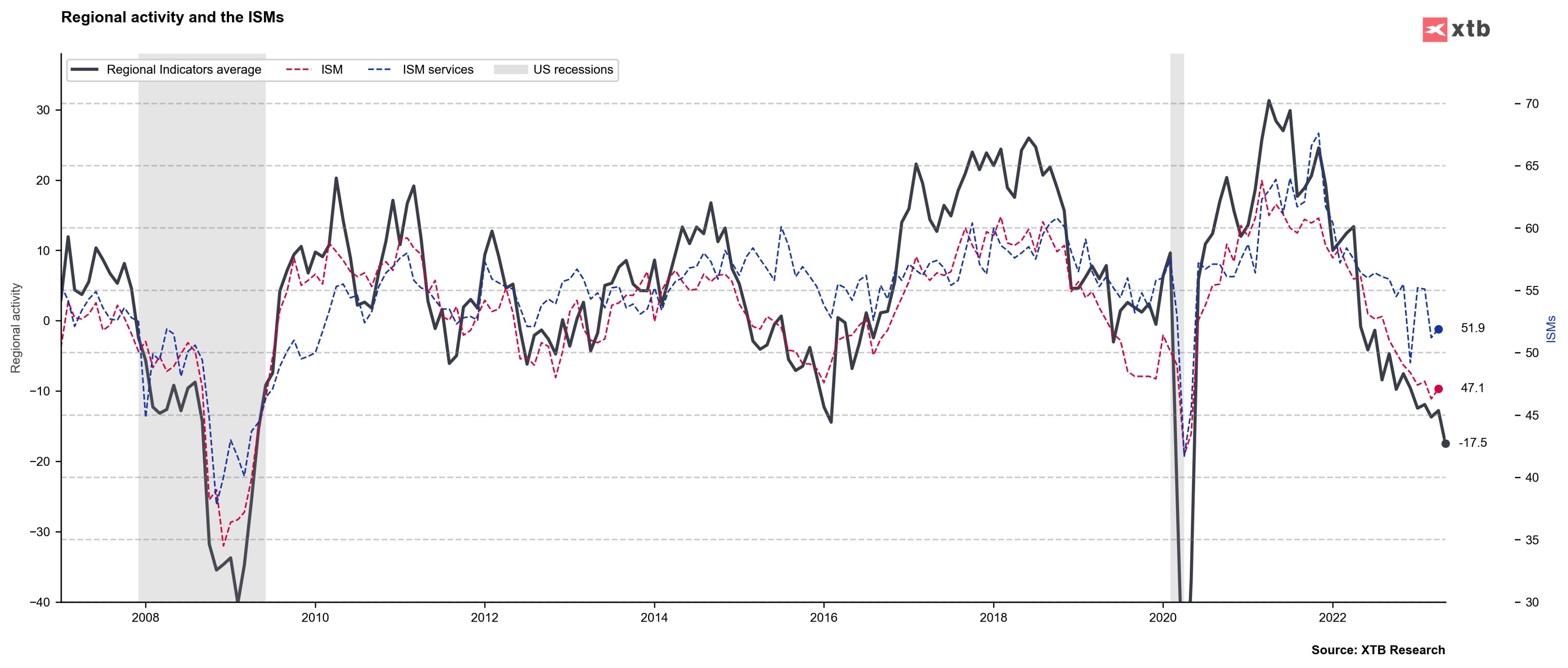 Regional indices in the US show further economic problems. Source: Macrobond, Bloomberg, XTB
