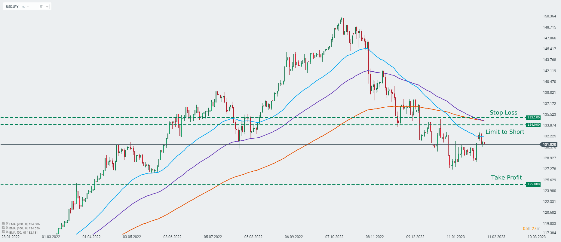 BNP Paribas recommends placing a limit order to short on USDJPY at 134.00 with a target of 125.00 and a stop loss order placed at 135.10. Source: xStation5