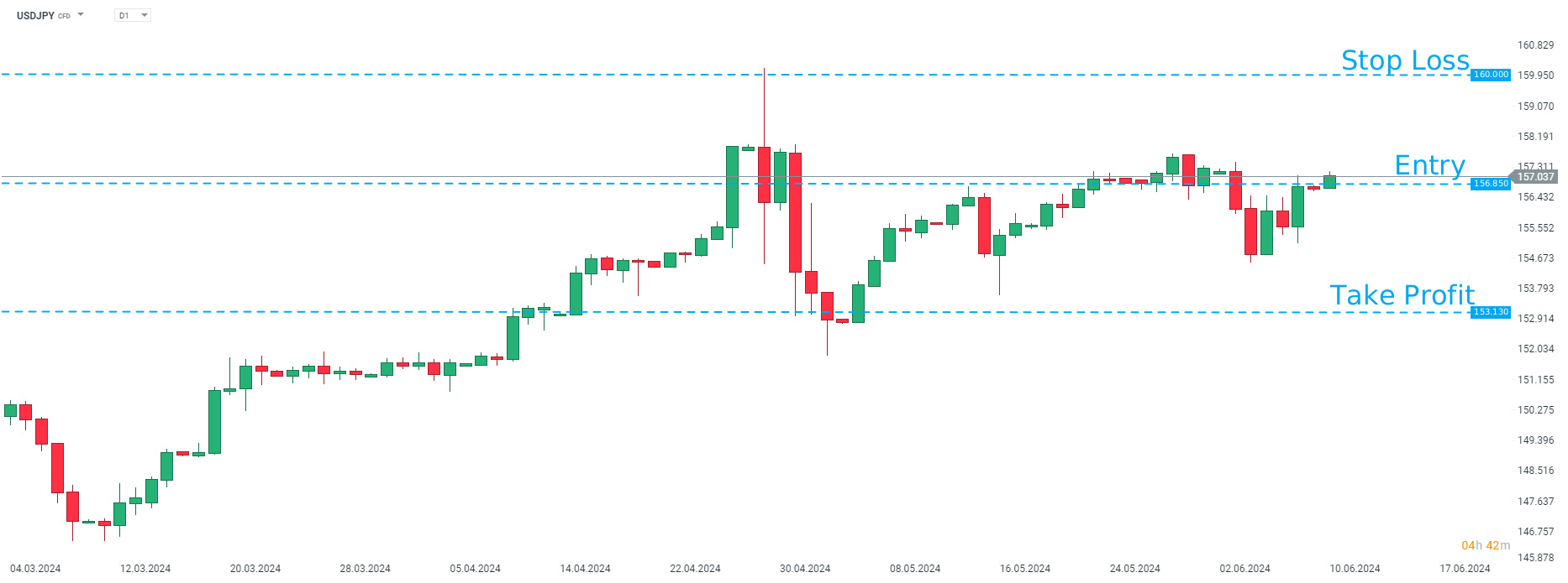 Credit Agricole recommends taking a short position on USDJPY at market price with a target of 153.13 and a stop loss order placed at 160.00. Source: xStation5