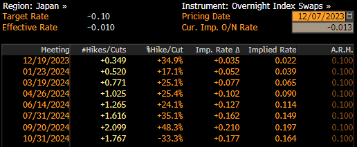 Money markets see around 35% chance of Bank of Japan delivering a 10 basis point rate hike at December meeting. Source: Bloomberg Finance LP