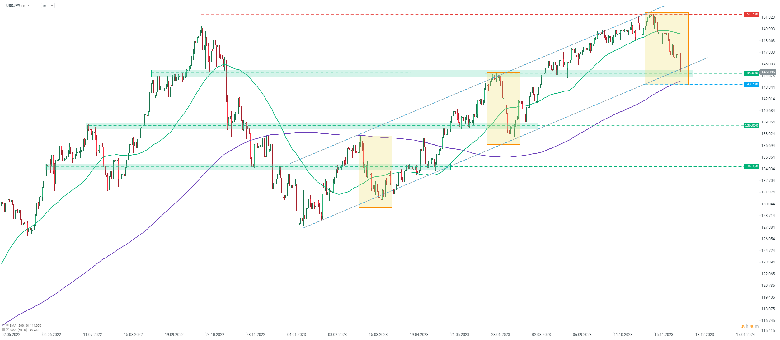 An expected hawkish turn by the Bank of Japan is pushing USDJPY 1.5% lower today. This is the biggest single-day drop for the pair since January 12, 2023 when the pair plunged 2.4%. Taking a look at USDJPY chart at D1 interval, we can see that the pair is making a drop below the lower limit of the bullish channel today and is testing the 145.00 support zone. A break below this area may be followed by a drop towards 143.70 zone, where a key support can be found. The 143.70 area is marked with the lower limit of the Overbalance structure as well as 200-session moving average and a move below this zone could hint at trend reversal.