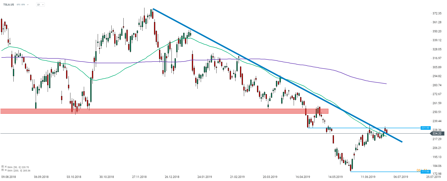 2019 was not a good year for Tesla (TSLA.US) shareholders so far. The stock declined over 30% YTD right now. However, share price greatly recovered in June as rumours over good delivery numbers began to surface. The price closed above 50-session moving average (green line) for the first time since late-February yesterday. The ongoing pullback may be just a “classic” retest of the recently broken downward sloping trendline. Source: xStation5