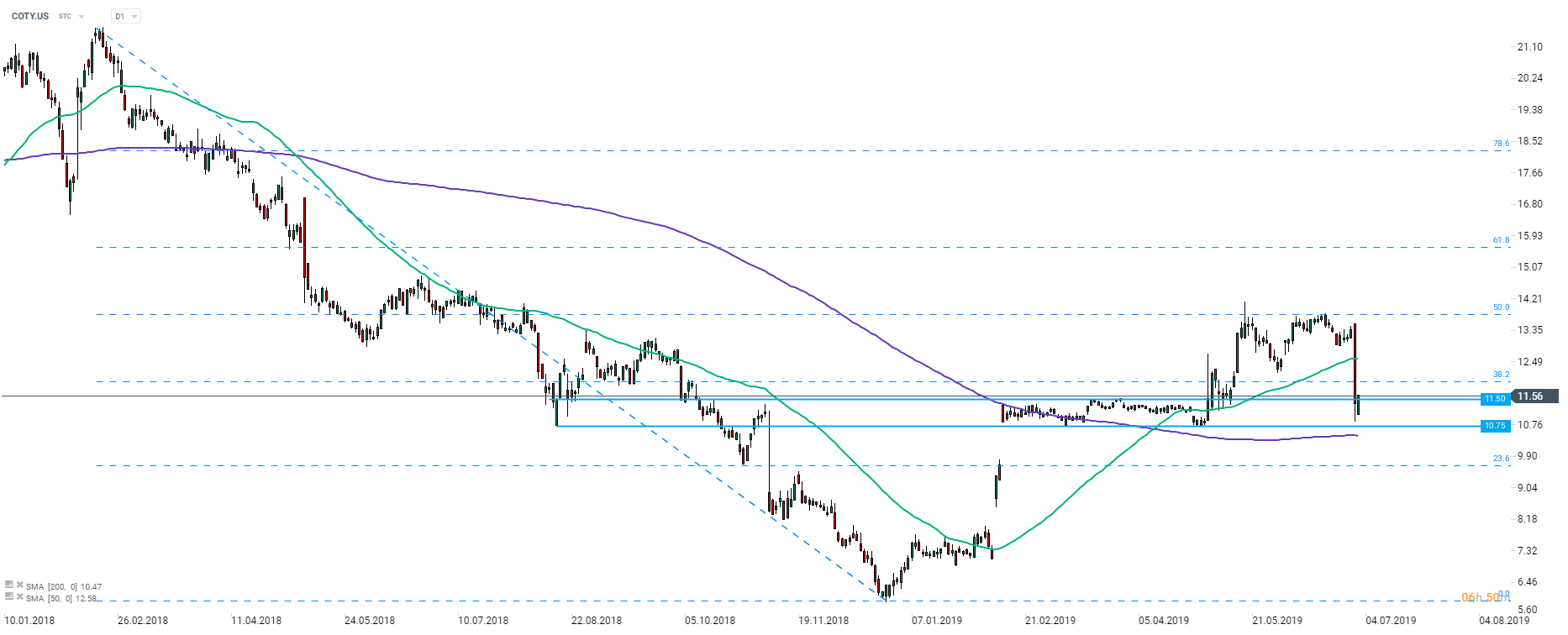Coty (COTY.US) more than doubled its valuation throughout the first half of 2019. However, recovery was halted at the 50% Fibo level of last year’s downward move. Nevertheless, even after yesterday’s drop the stock is trading 75% higher YTD. Share price is testing the nearest major resistance at press time - the upper limit of February-May trading range at $11.50. Source: xStation5