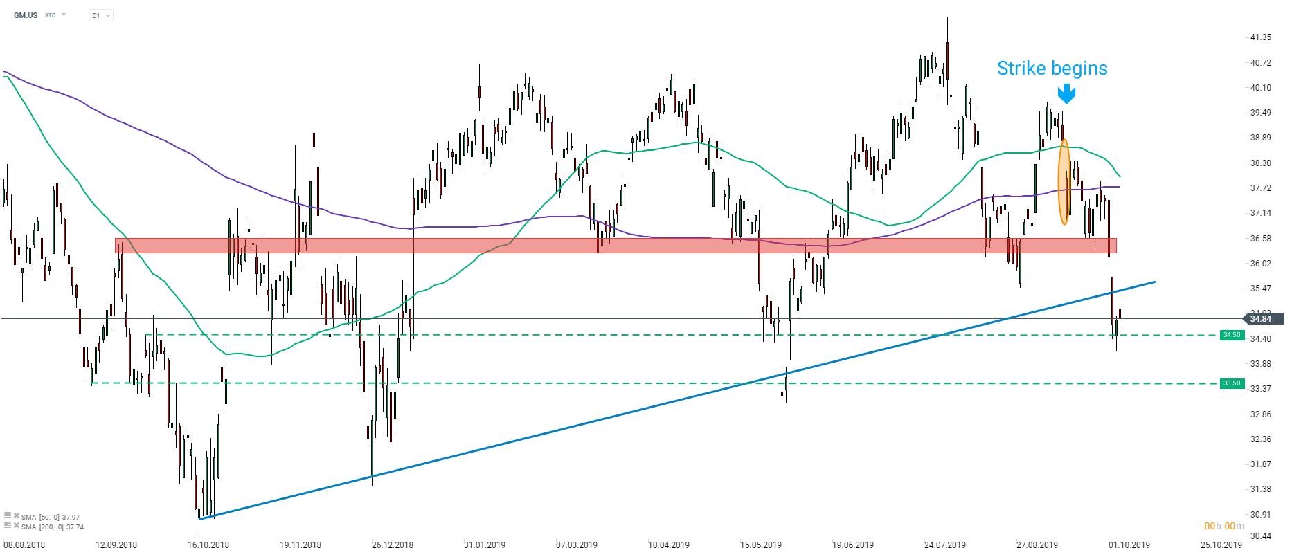 General Motors (GM.US) slumped around 10% since the workers’ strike began. Share price broke below the upward sloping trendline in the previous week but found bottom at $34.50 handle. However, lack of progress in talks hints that the company may remain under pressure. It is estimated that during the past three weeks GM suffered a loss of $1 billion or more. In case bears’ dominance prevails, the next support could be localized at $33.50 handle. Source: xStation5