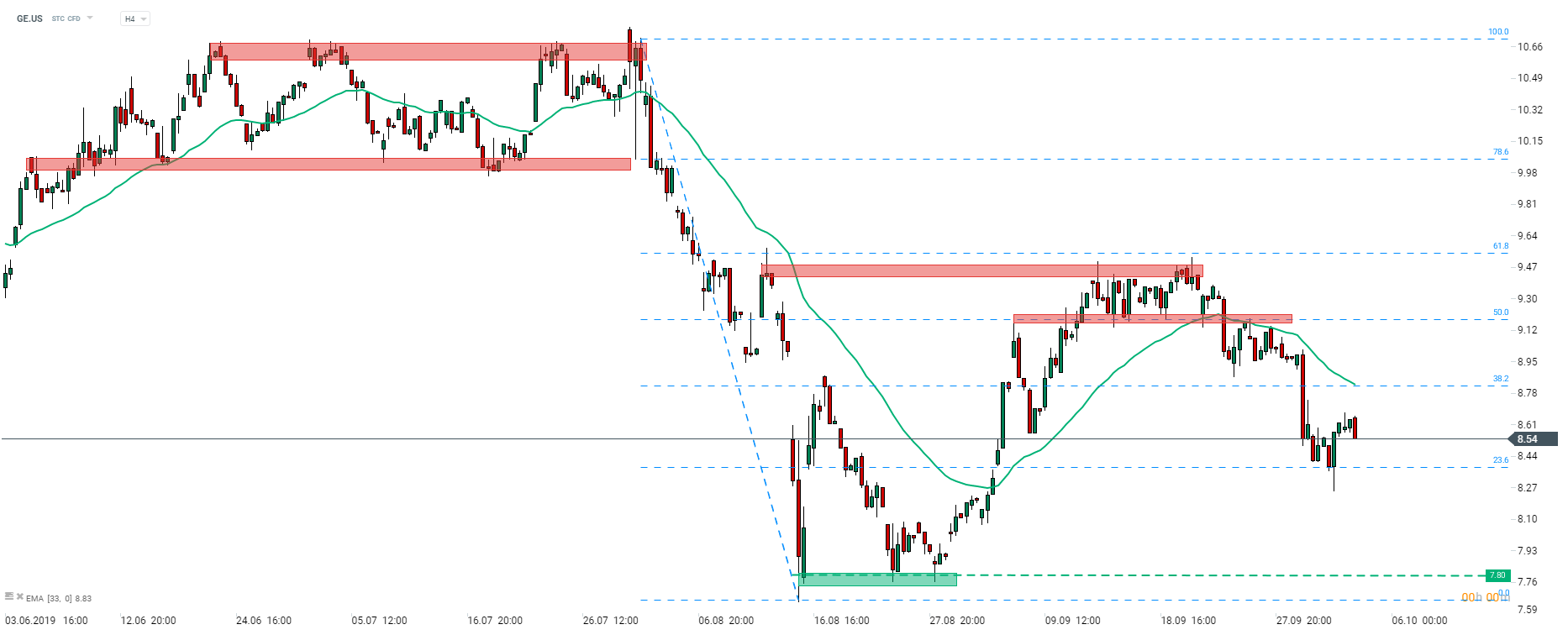 General Electric (GE.US) took a dive of around 30% at the turn of July and August.The subsequent recovery was halted slightly below the 61.8% retracement of the aforementioned decline. The stock pulled back once again after a few days of struggling in between 50% and 61.8% Fibo level. The latest local low at $8.40 is the first support level to watch and in case it fails to fend off the bears, the swing level at $7.80 could come into play. The combination of 33-period exponential moving average (green line, H4 interval) and 38.2% Fibo is the nearest resistance. Source: xStation5